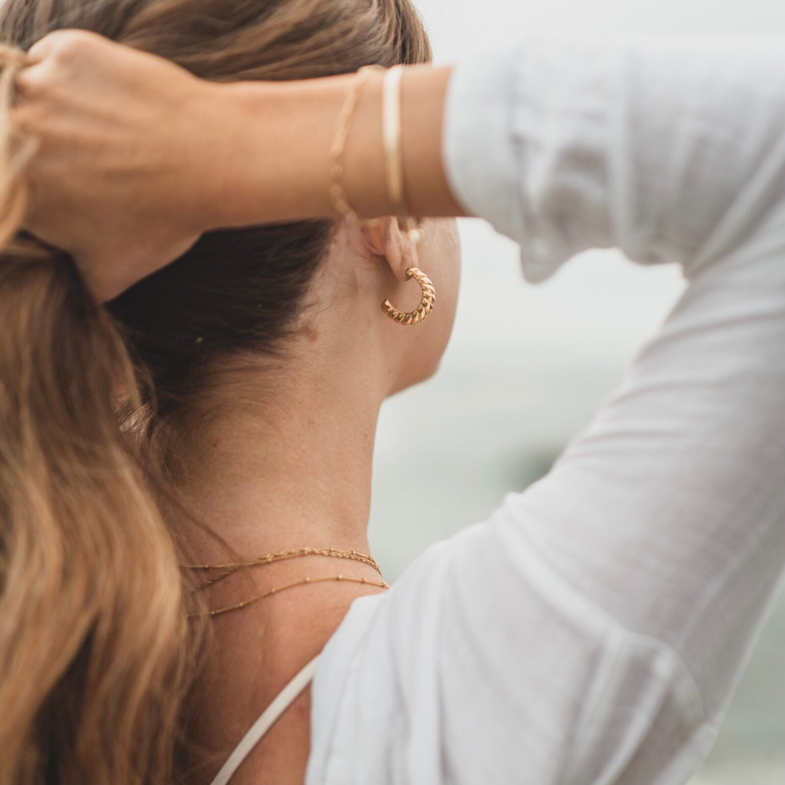 Gold-plated jewelry features a layer of gold over a base metal, providing an attractive finish similar to real gold. We use gold plating over stainless steel to ensure durability, as stainless steel resists scratches and corrosion, making our jewelry tarnish-resistant.