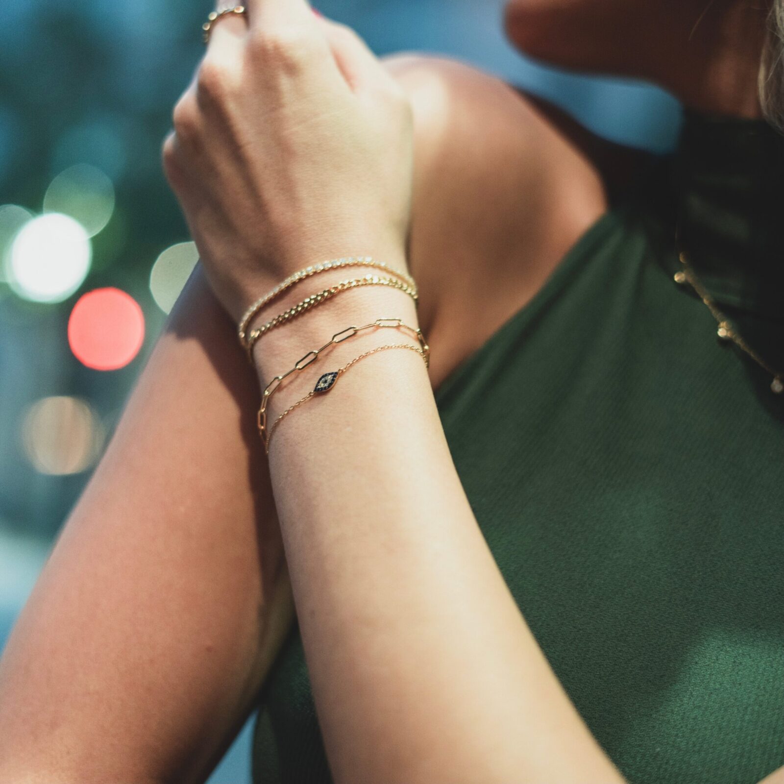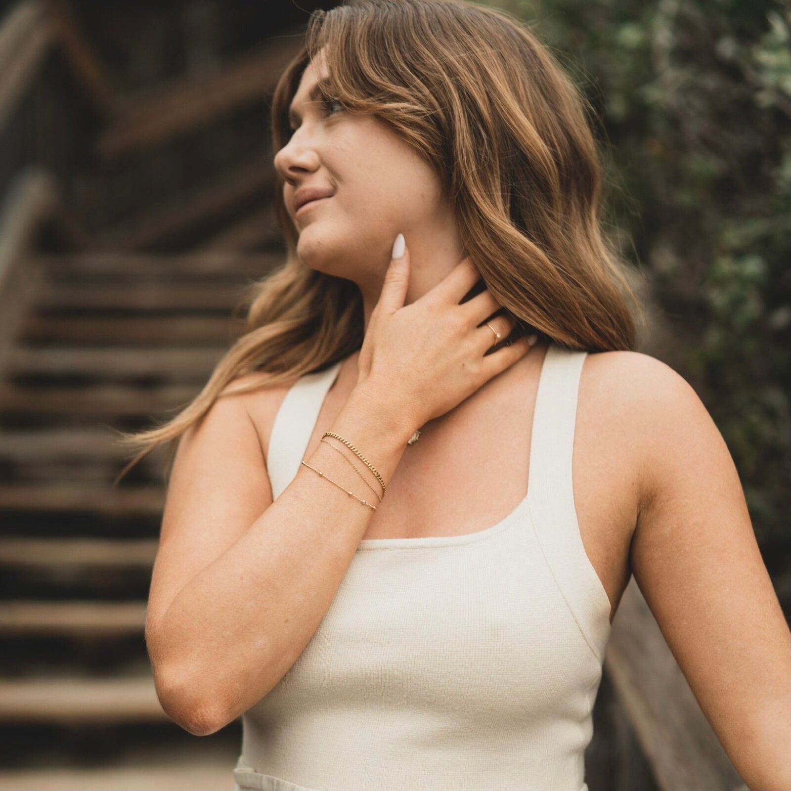Gold-plated jewelry features a layer of gold over a base metal, providing an attractive finish similar to real gold. We use gold plating over stainless steel to ensure durability, as stainless steel resists scratches and corrosion, making our jewelry tarnish-resistant.